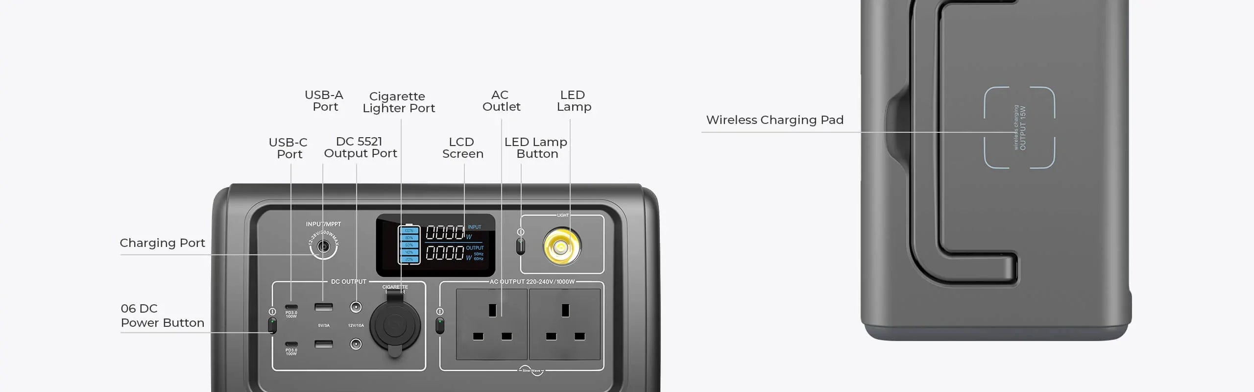 - 2*230V AC outlets, 2*100W PD ports, 2*5V/3A USB-A ports, 2*regulated 12V/10A DC outputs, 1*12V/10A car port,1*15W wireless charging pad.
